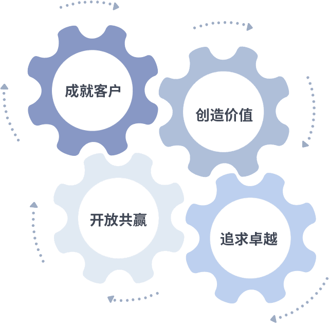 成就客户是一切决策的出发点,,创造价值是衡量所有工作的标准,,,,追求卓越是我们做事做人的态度,,开放共赢是我们的格局也是最终的结果。。价值观的齿轮环环相扣,,,,推动着组织里的每个人不断向前。。